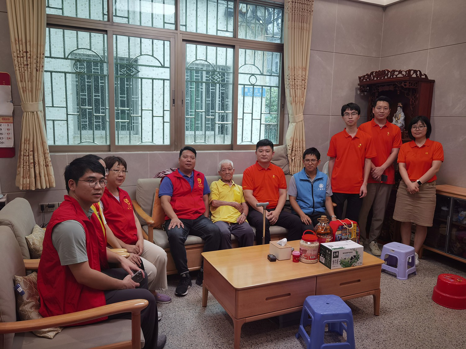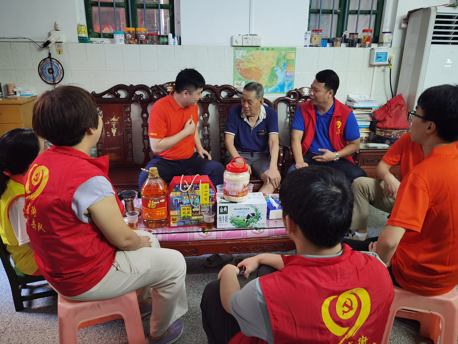 6月20日下午,活动统筹人周雁玲、党员苏泽彬、黄旭、周超与沙涌村党支部成员、大龙街社工站成员,一同深入大龙街沙涌村入户探访老党员,向他们致以端午节日的问候并送上生活用品一批。