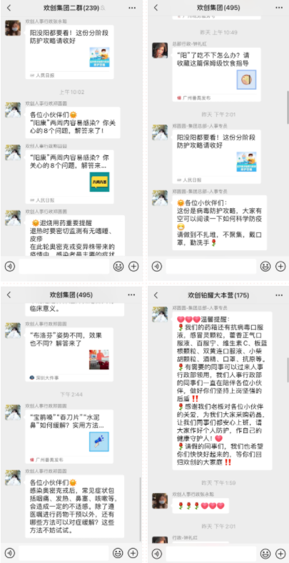 每天,人事部小姐姐在群里积极宣传科学防疫知识,问候和关心员工的身体情况,主动消毒保证办公环境干净卫生,确保防疫工作落到实处,确保员工及其家人的生命安全和身体健康得到保障,真正做到“以人为本,把员工当亲人”。