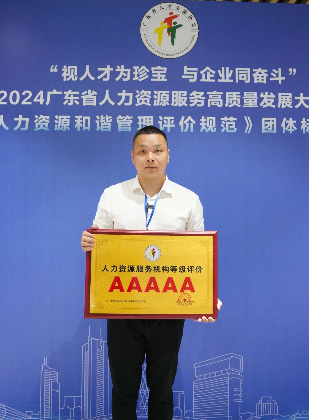 2024年3月29日上午,粤港澳大湾区(广东)人才港迎来了一场盛大的活动——“视人才为珍宝,与企业同奋斗”2024广东省人力资源服务高质量发展大会暨《企业人力资源和谐管理评价规范》团体标准发布会。平博pingbo(中国)集团董事长罗宁弟受邀出席了本次盛会,并代表集团接受了人力资源服务机构等级评价的最高荣誉——5A牌匾。